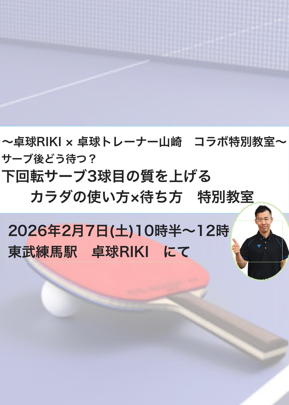 卓球RIKIコーチによる下回転サーブ後の「待ち方」や3球目を攻める際の考え方など、戦術面の解説もセットで行います。